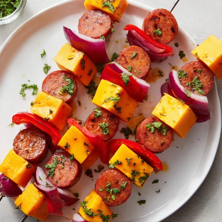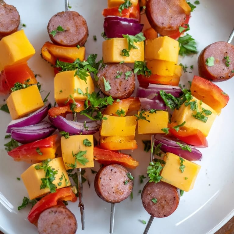 Save Pin A hearty and flavorful appetizer featuring smoky sausage rounds and melty cheese cubes stacked and grilled on skewers, perfect for sharing at gatherings.