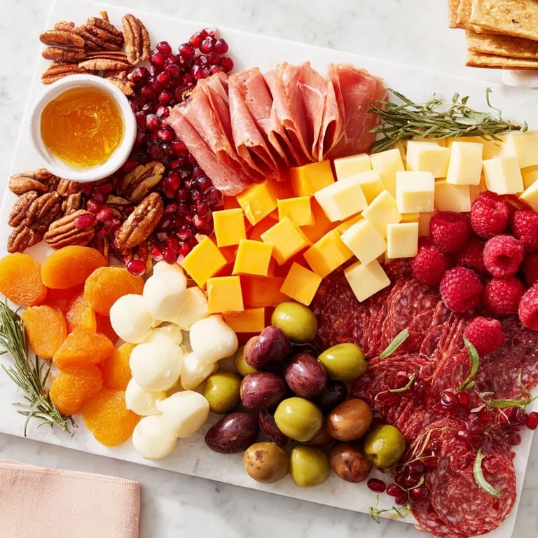 Cluster fresh grapes, raspberries, and pomegranate seeds in gaps for color and freshness, while dried apricots and figs add chewy texture and sweetness.