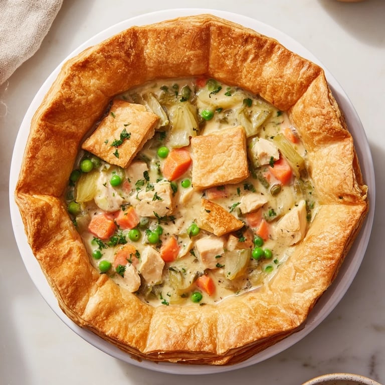 Save Pin A rustic, comforting chicken pot pie infused with aromatic bay leaf and fresh herbs, nestled beneath a golden, flaky pastry crust. Perfect for cozy dinners and family gatherings.