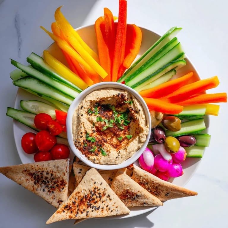 The absolute best moment to serve this platter is within 30 minutes of assembly, while everything is at peak crispness and the dips are cool and creamy. I've made it up to 2 hours ahead for a party and found that if I cover the vegetables loosely with a damp paper towel and keep the dips covered separately, most of the texture holds. The bread, though—always warm it at the last minute. There's nothing worse than stale, chewy pita when you're dipping, and your guests will taste that care immediately.