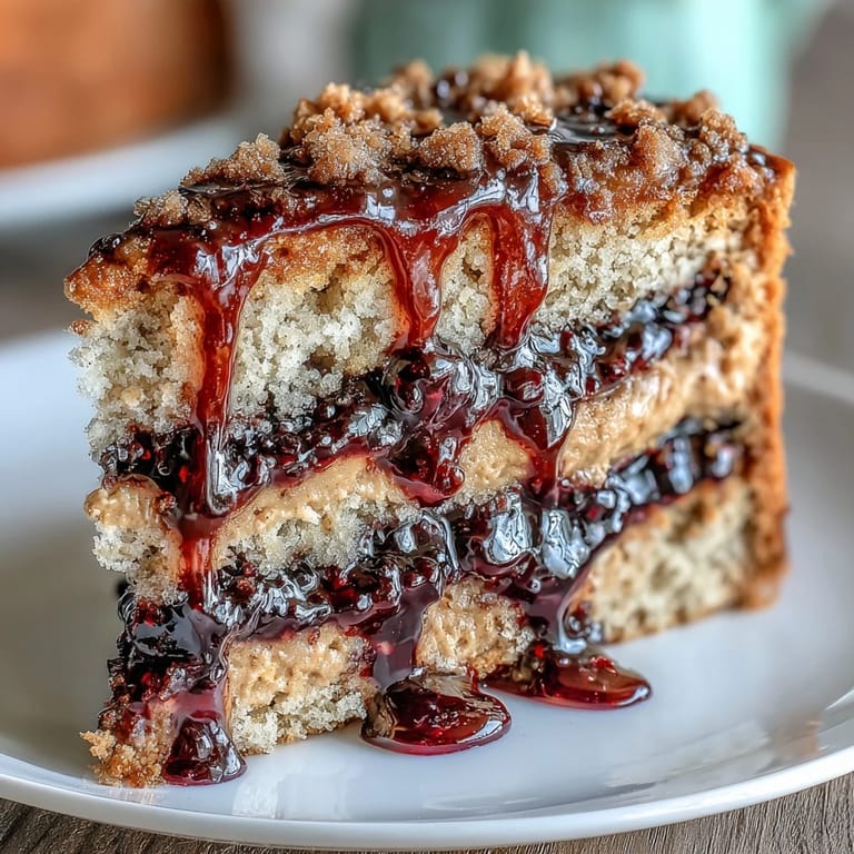 Save Pin My neighbor Sarah handed me a jar of homemade black currant jam one autumn afternoon, insisting I do something interesting with it. I'd been craving something that felt like childhood comfort but with a grown-up twist, and suddenly the idea struck: what if I took the nostalgic simplicity of a peanut butter and jelly sandwich and turned it into cake? The result was this surprisingly elegant dessert that tastes like a sophisticated memory, with a tender peanut butter crumb giving way to tart jam and a glossy dark sauce that catches the light just right.