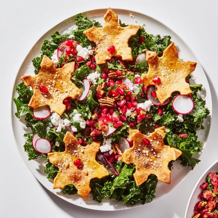 Save Pin A festive winter salad featuring crisp greens, vibrant vegetables, and crunchy tortilla chips shaped like snowflakes, served with a bright homemade salsa.